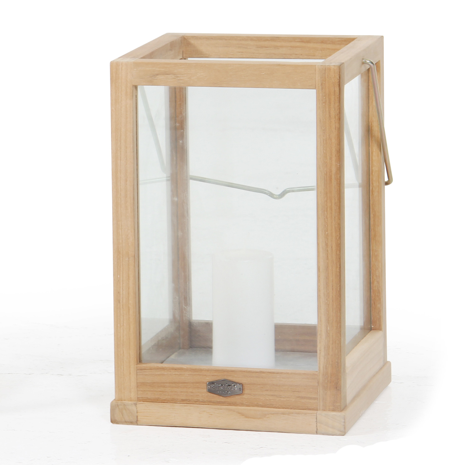 Stilren ljuslykta i teak/glas. Lyktan har rostfritt handtag och är dränerad i botten.