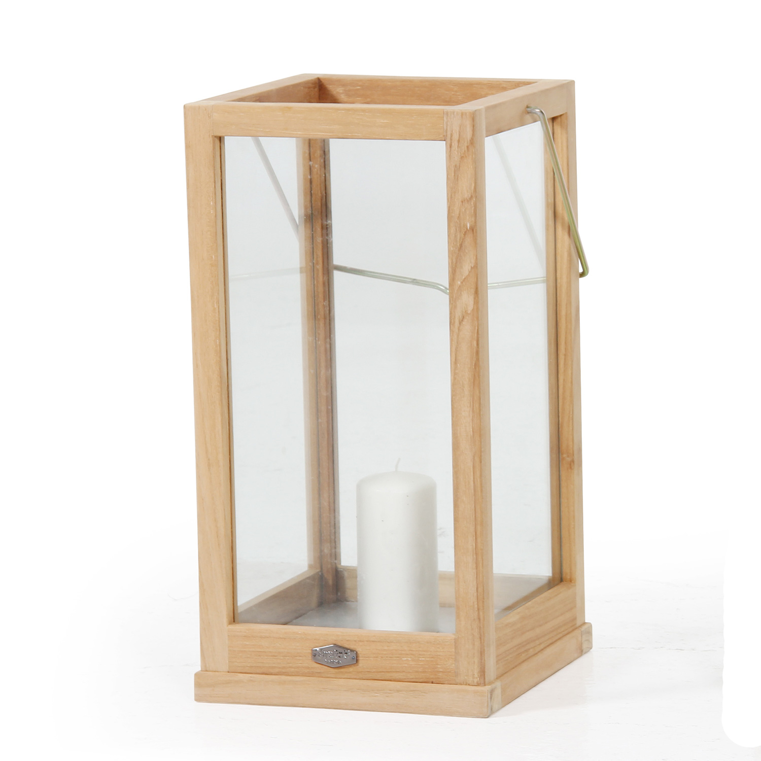 Stilren ljuslykta i teak/glas. Lyktan har rostfritt handtag och är dränerad i botten.