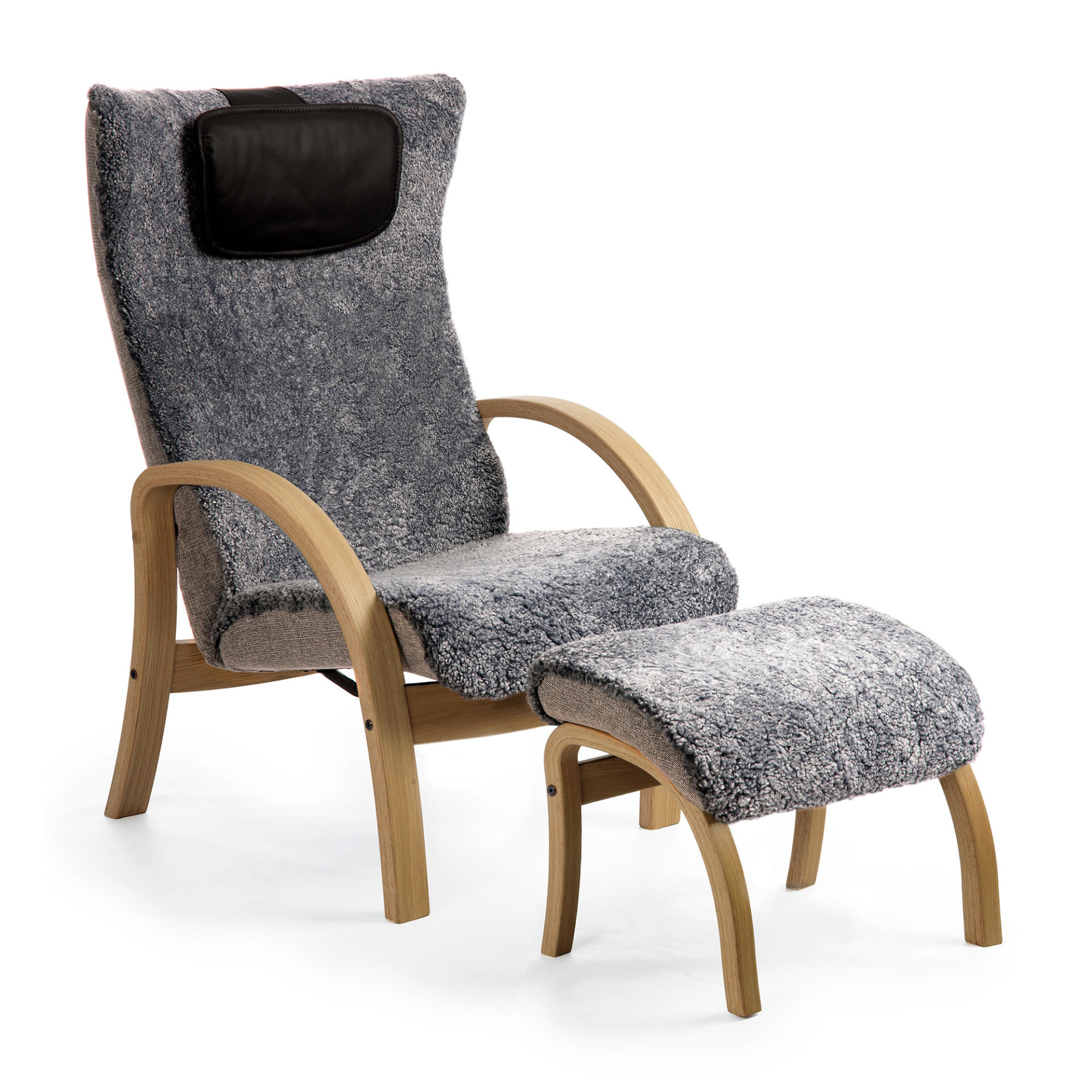 Easy är en klassisk fårskinnsfåtölj med stomme i massiv vitoljad ek, glidfunktion. Nack kudde i svart läder för extra komfort. I paketet ingår även en matchande fotpall. Från Svenska Conform.